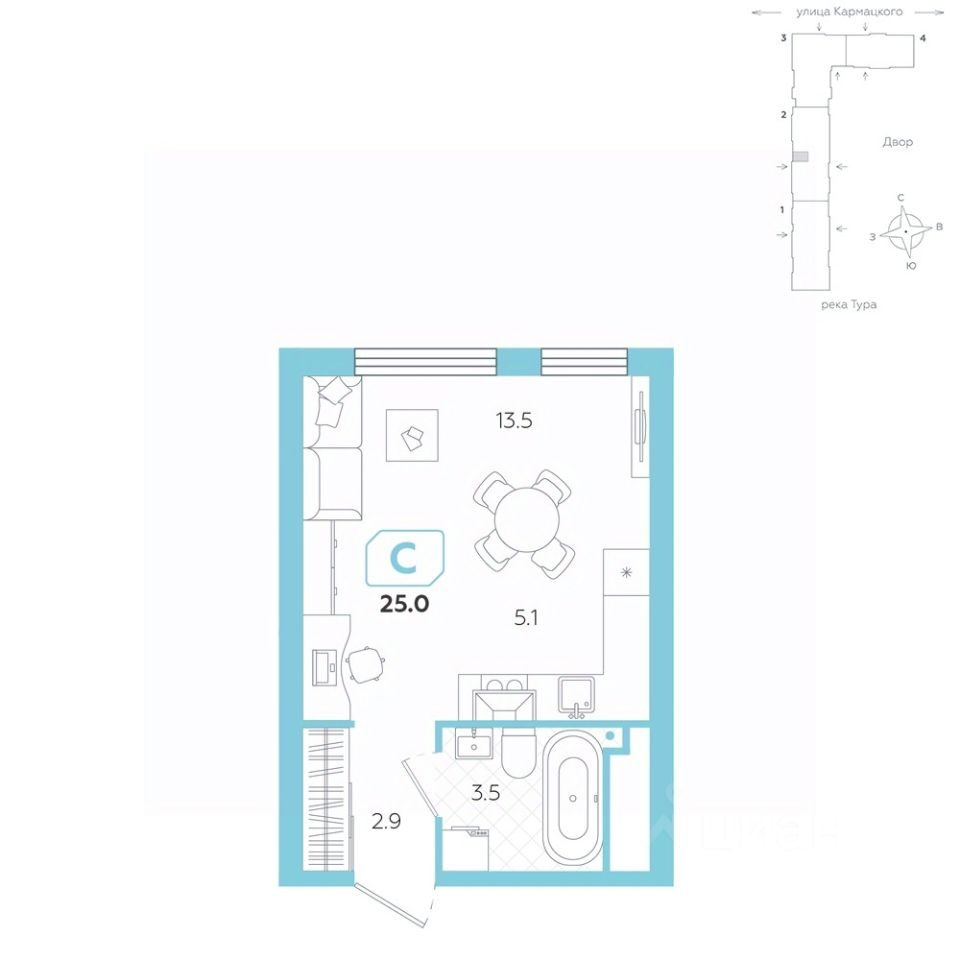Уютная студия обладает правильной геометрией, что позволяет максимально эффективно использовать пространство.