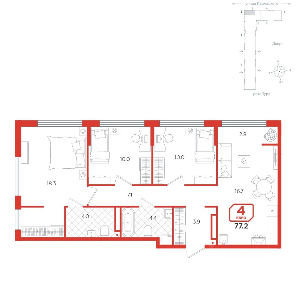 В детских комнатах предусмотрены функциональные зоны для учебы, досуга и отдыха. Это создает комфортную среду для развития и творчества, позволяя детям не только учиться, но и играть, а также наслаждаться спокойными моментами отдыха. Выход на балкон добавляет дополнительное преимущество, предоставляя возможность наслаждаться свежим воздухом и видами за пределами квартиры.