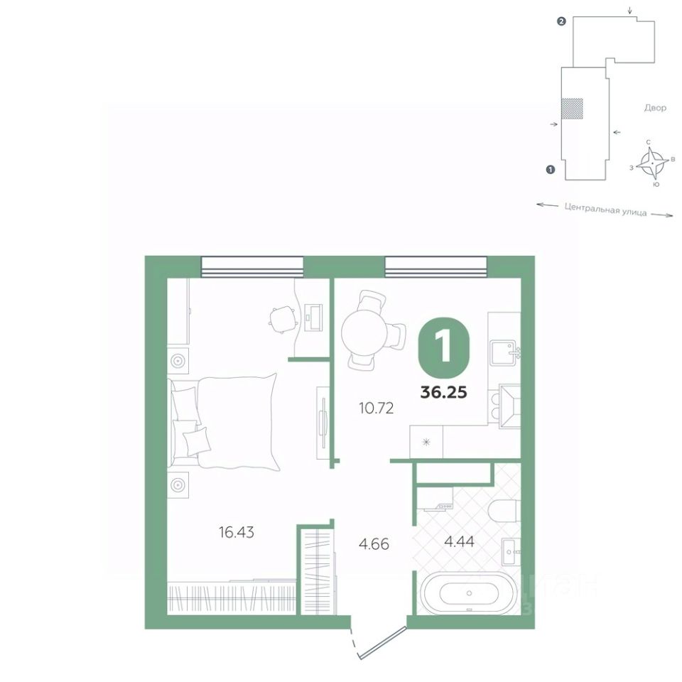 Площадь квартиры 36.25 м2 . Высота потолка 2,7 м.