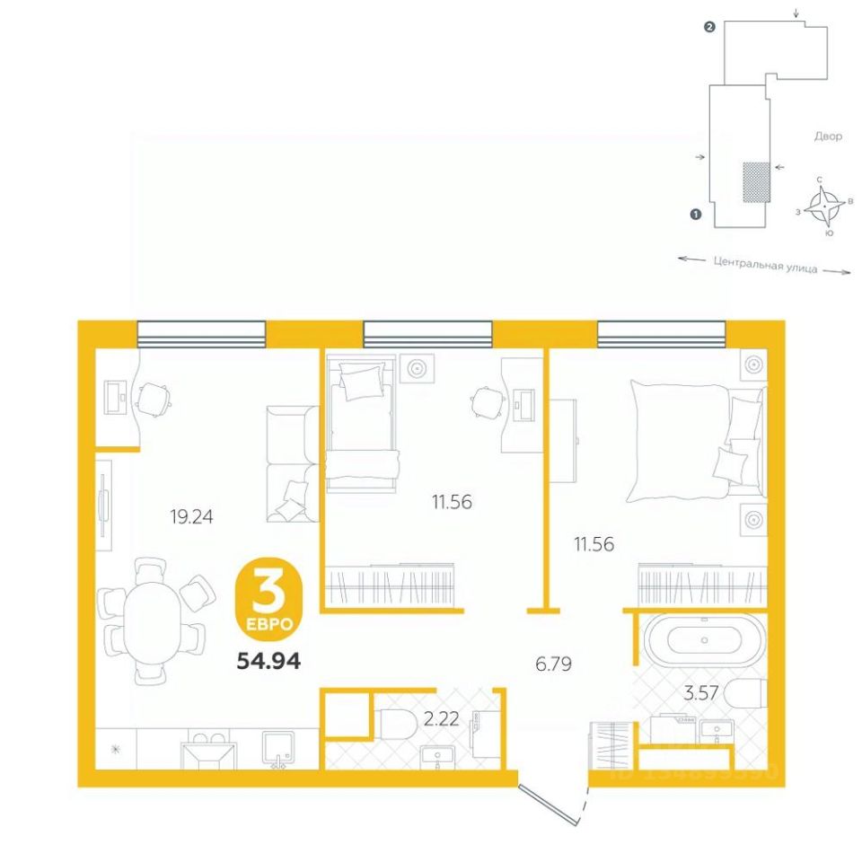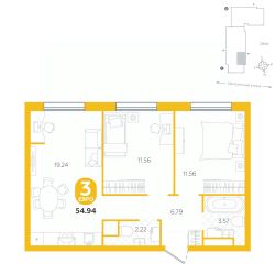 Площадь квартиры 54.94 м2 . Высота потолка 2,7 м.
