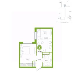 Площадь квартиры 36.08 м2 . Высота потолка 2,7 м.