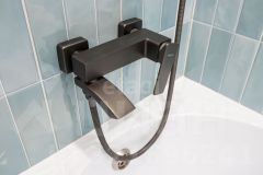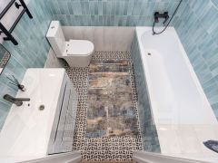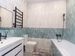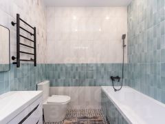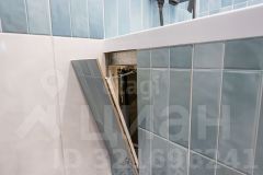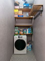 В квартире по проекту два санузла. Один совмещённый под ванную с туалетом - отделан полностью керамической плиткой. Второй санузел используется как постирочная с гардеробной.
