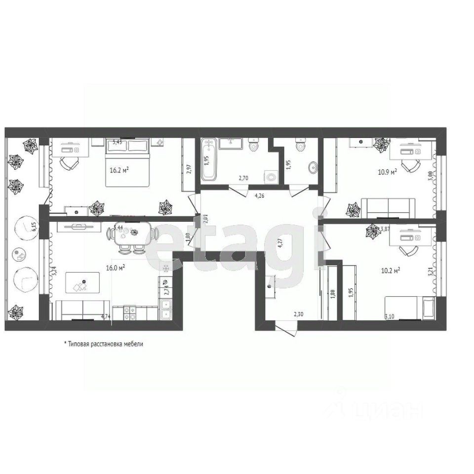 - Общая площадь 76м2. (кухня-гостиная - 16м2, комнаты: 16 м2, 11м2, 11м2)