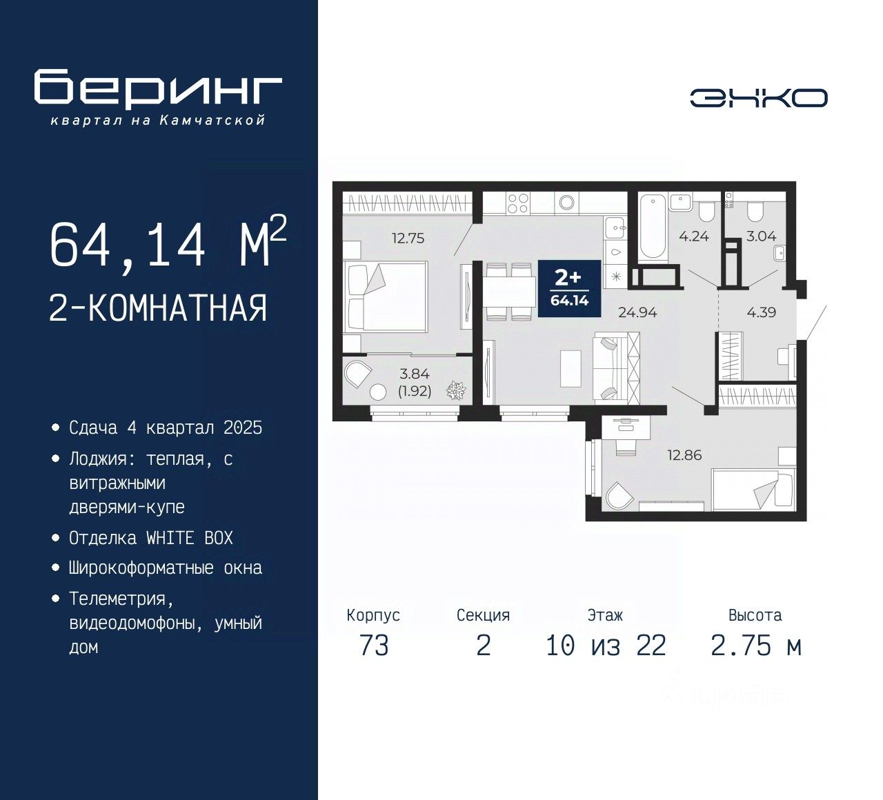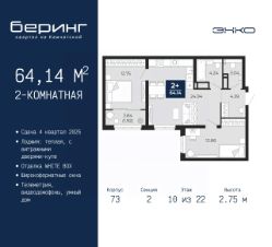 Просторная двухкомнатная квартира в ЖК "Беринг" на 10 этаже. Квартира без отделки, новый владелец может сделать ремонт по индивидуальному дизайн-проекту. Общая площадь: 64.14 кв.м., жилая: 25.61 кв.м., площадь просторной кухни-столовой: 24.94 кв.м. Угловая квартира, очень светлая, естественная вентиляция при открытии окон. В квартире одна лоджия, один совмещенный и один раздельный санузел. Высота потолков 2.75 м.