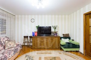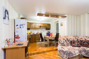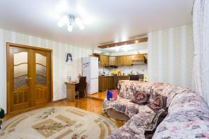 Стены выровнены в обоях, пол деревянный, потолок натяжной, в прихожей в зеркальной плитке, санузел в кафеле, утепленный балкон, межкомнатные двери из сосны. В квартире остаются кухонный гарнитур и тумба под ТВ из натурального дерева(остальная мебель по договоренности).