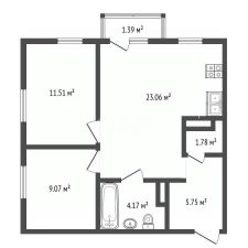 Внутреннее пространство включает в себя уютную кухню-гостиную площадью 23,06 м², две светлые спальни (9.07 м² и 11,51 м²), функциональных 2 санузла 4.17 и 1.78 м² и коридор 5,75 м².