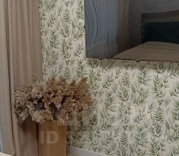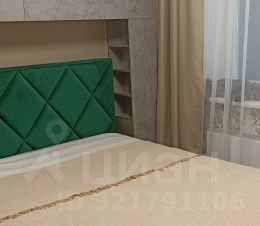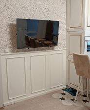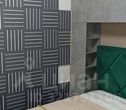 В маленькой спальне кровать из антивандальной ткани с подъемным механизмом и ортопедический матрас Ormatek. Вокруг кровати встроенный вместительный шкаф, телевизор Xiomi "50. Одна стена в комнате из декоративной акустической панели