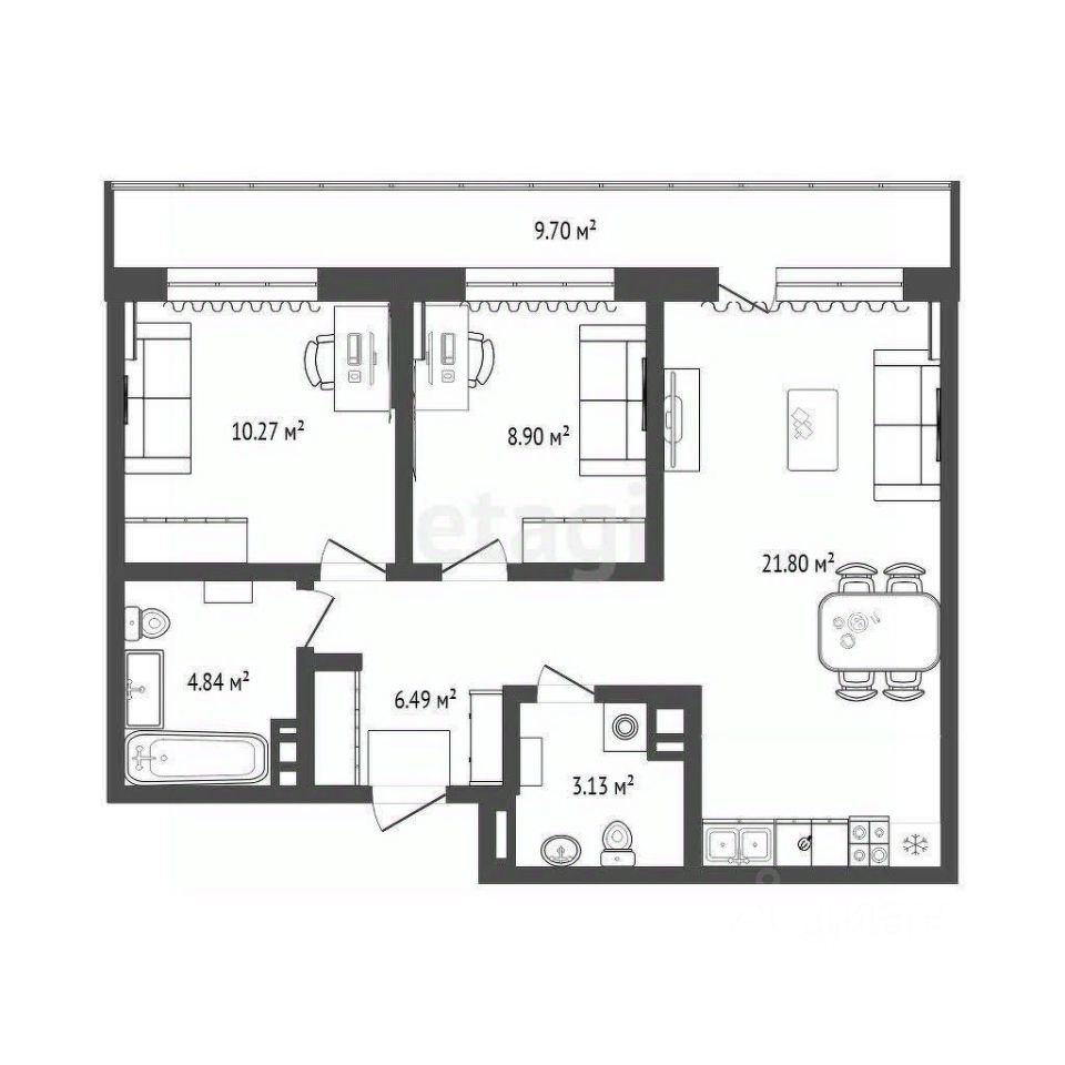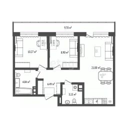 В квартире 2 отдельные спальни 10.27 и 8.9 кв.м., просторная кухня-гостиная 21.8 кв.м., открытый балкон 9,7 кв.м.