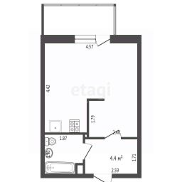 Планировка: комната прямоугольной формы с разделением на зону готовки и зону отдыха. Имеется свой просторный балкон с видом во двор. Санузел совмещенный. При входе есть ниша под верхнюю одежду и обувь.