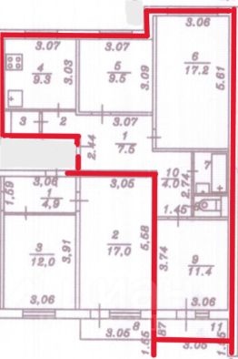 Площади жилых комнат: 9,5 кв.м., 11,4 кв.м., 17,2 кв.м.