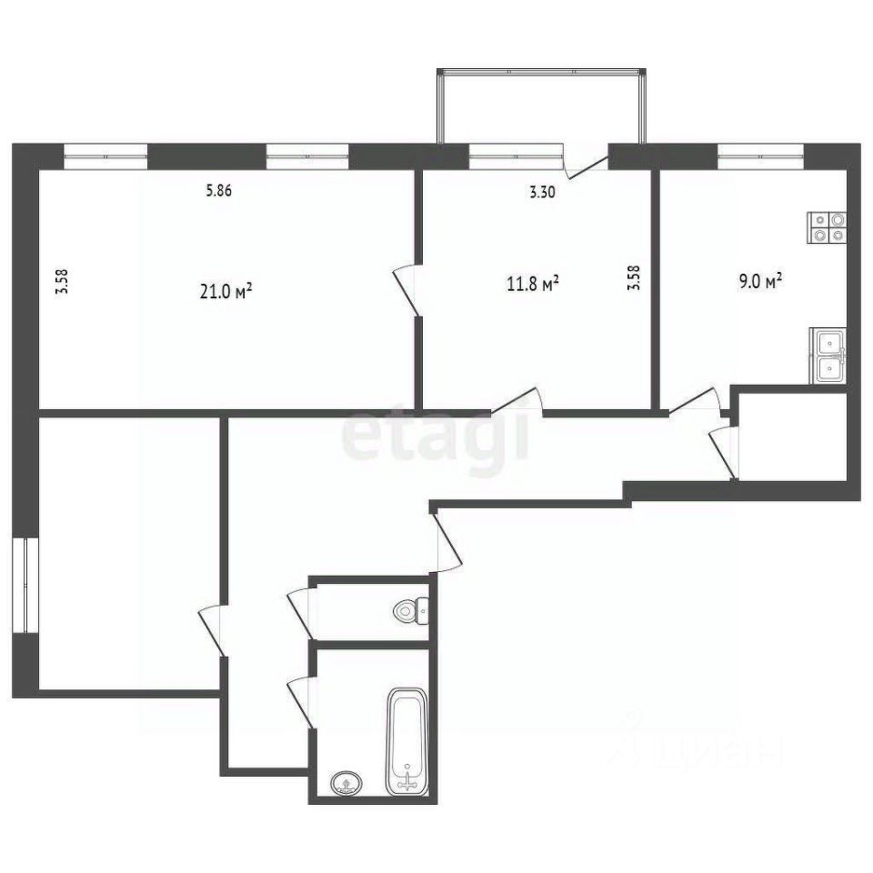 Комнаты площадью - 21 м.кв., и 11,8 м.кв. В большой комнате есть выход на балкон площадью 3 м.кв.