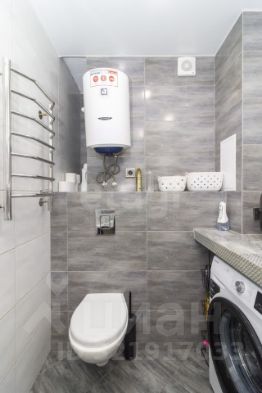 Просторная ванная комната выложена плиткой, установлен водонагреватель, инсталляция, тёплый пол.