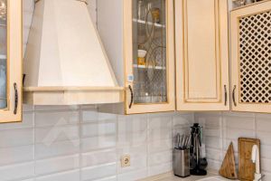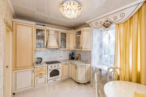 Кухня — с гарнитуром, техникой, столом и стульями,