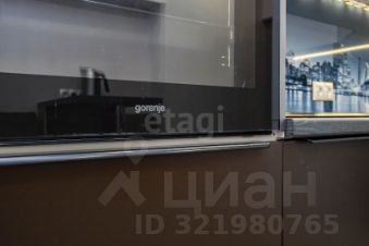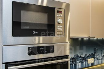 — Просторная кухня-гостиная, укомплектованная стильной мебелью и встроенной техникой.