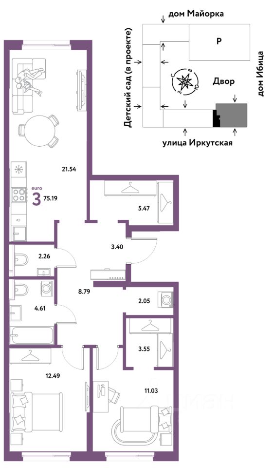 Продается 3комнатная квартира на 18 этаже от застройщика Страна Девелопмент. Площадь квартиры 55,51 кв. м.