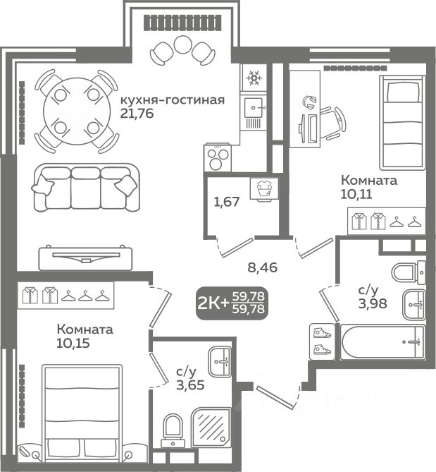 Прямая продажа от застройщика! Продается двухкомнатная квартира в строящемся ЖК "Меридиан Слобода", срок сдачи: I-кв. 2027, общей площадью 59.78 м², на 8 этаже из 21. Площадь кухни — 21.76 м².