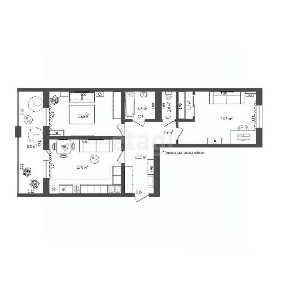 Просторная 2-комнатная квартира 66,9 м² с балконом 8,8 м² в кирпичном доме 2022 года постройки. Высокие потолки создают ощущение простора, а панорамное остекление балкона наполняет пространство светом. Окна выходят на две стороны на живописную реку и ухоженный двор.