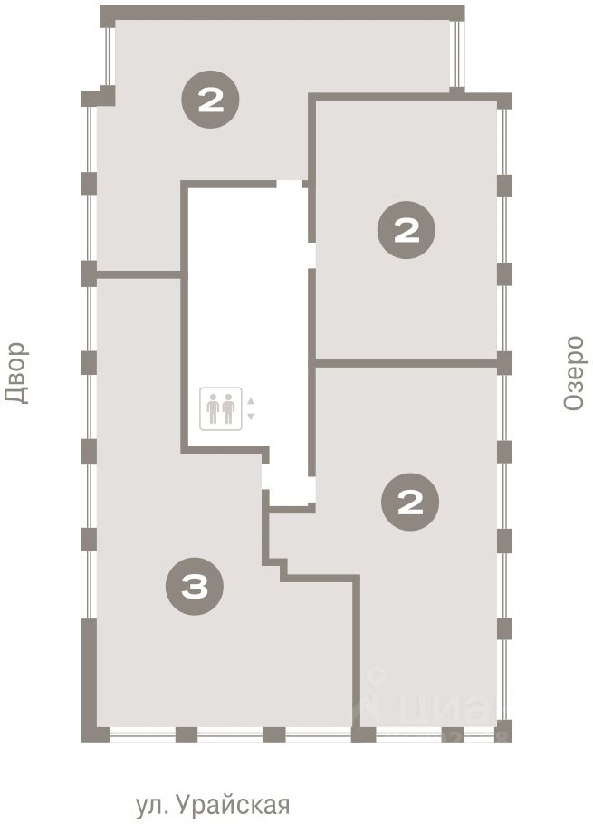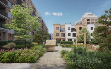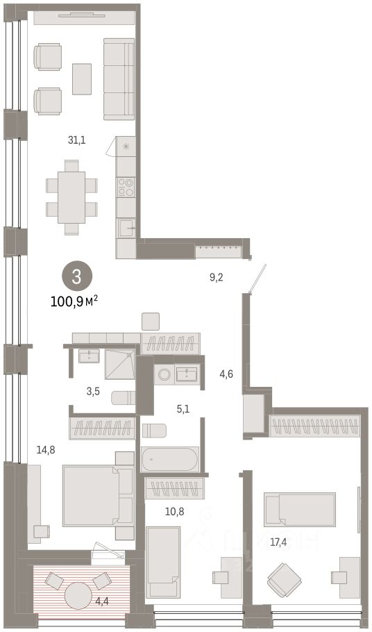 Квартира с кухней-гостиной и тремя спальнями в Доме у озера. Особенности планировки: вид во двор, панорамное остекление, лоджия, предчистовая отделка, мастер-спальня.