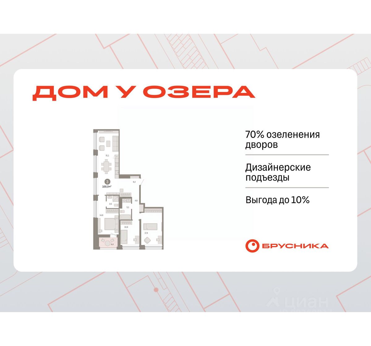 3-комн. квартира от застройщика с предчистовой отделкой в ЖК "Дом у озера" на 6 этаже. Общая площадь: 100.88 кв.м. Высота потолков 2.7 м.