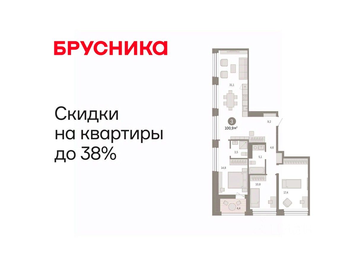 Продается 3-комн. квартира от застройщика с предчистовой отделкой в ЖК "Дом у озера" на 6 этаже. Общая площадь: 100.88 кв.м. Высота потолков 2.7 м.