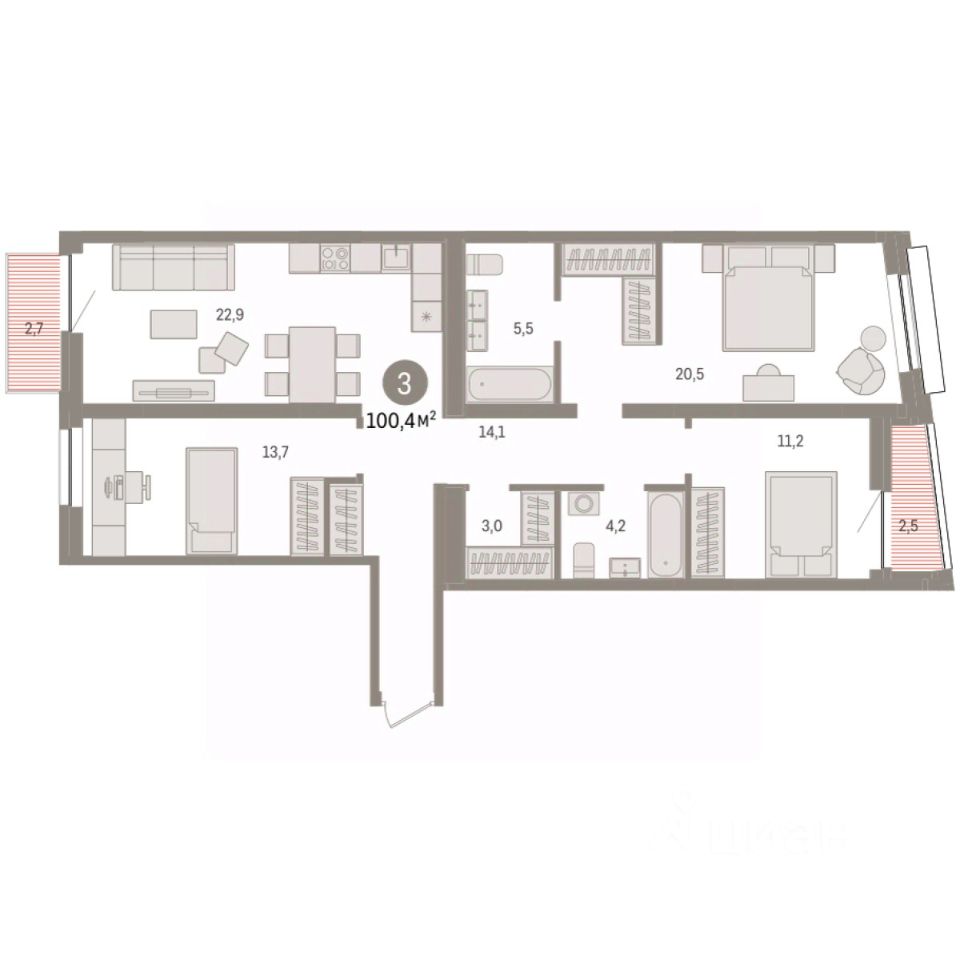 Квартира с кухней-гостиной и тремя спальнями в жилом районе "Речной порт". Особенности планировки: гардеробная, вид во двор, разнесённые спальни, предчистовая отделка, мастер-спальня, балкон.