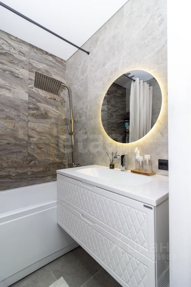 В ванной и санузле практичная и красивая керамическая плитка. Дизайнерское освещение в квартире создает атмосферу тепла и уюта.
