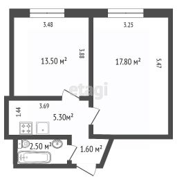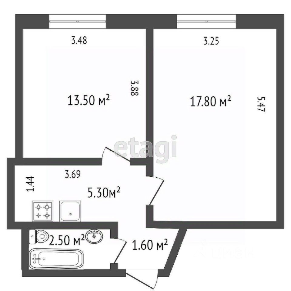 В квартире 2 отдельные жилые комнаты - 17 кв м и 12,9 кв м. Кухня компактная - около 5 кв м. Просторный санузел , ванна и туалет совмещенные.