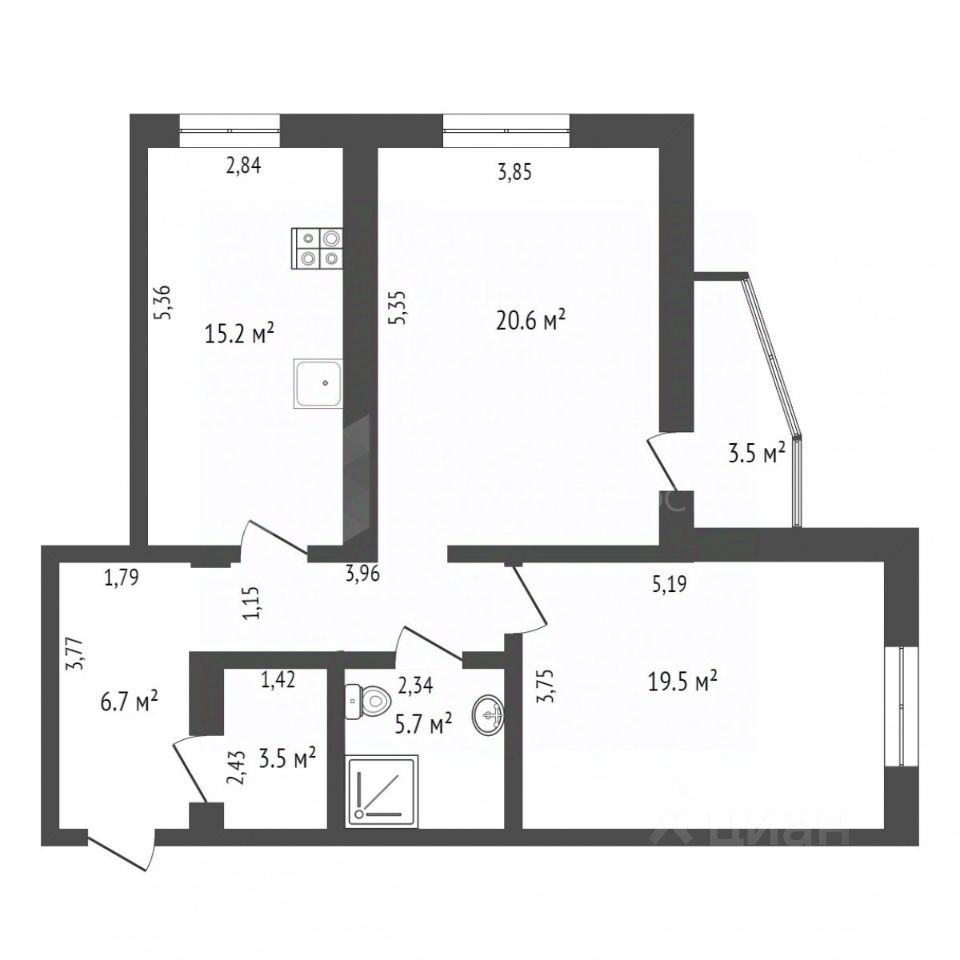 - 2 просторные комнаты; кухня-гостиная 15 м2;
