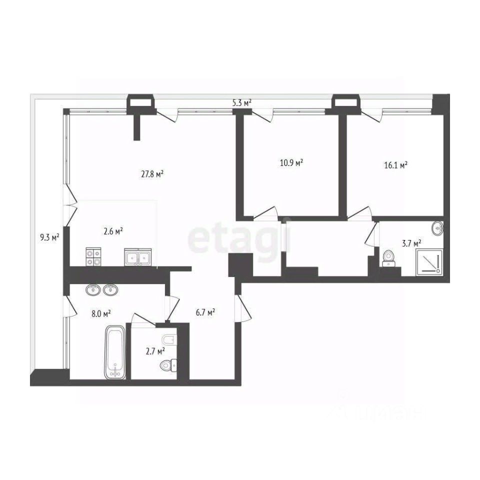 30 кв.м площадь кухни-гостиной, две комнаты 11 кв.м и 16кв.м, два санузла и гардероб. Прекрасная террасса по всему периметру квартиры, выход на которую осуществляется с каждой комнаты.