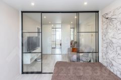 Продается однокомнатная квартира площадью 34 м², расположенная на 9 этаже . Объект отличается продуманной планировкой и качественной отделкой, что делает его комфортным для проживания. Комната площадью 23 м² разделена на две функциональные зоны с помощью стеклянных раздвижных дверей: в одной расположена спальная зона с кроватью 180200 см и ортопедическим матрасом, в другой — гостиная с раскладным диваном, трехсекционным шкафом-купе и подвесной тумбой под телевизор. Из спальни есть выход на остекленный балкон с видом на детскую площадку.