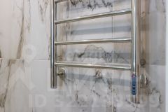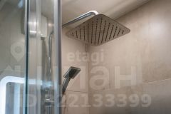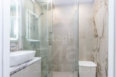 Санузел раздельный, в ванной комнате установлена душевая кабина, подвесная тумба с раковиной, электрический полотенцесушитель и зеркало с подсветкой. В туалете — подвесной унитаз с гигиеническим душем и встроенный шкаф для хранения бытовой химии. В отделке использованы практичные материалы: ламинат в жилой зоне, керамогранит в санузле, натяжные потолки с люстрами и точечными светильниками, а также бра в комнате.