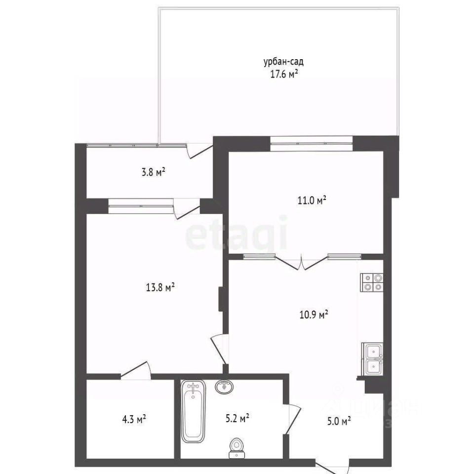 Площадь: 51.99 кв.м. + урбан-сад 17 кв.м.