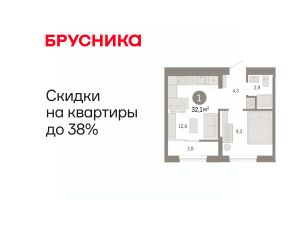 Квартира с кухней-гостиной и одной спальней в Октябрьском на Туре. Особенности планировки: вид во двор, тёплая лоджия, предчистовая отделка.
