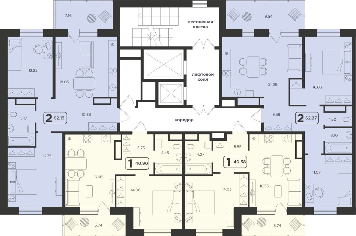 В домах микрорайона "Горизонт" представлены студии и квартиры с количеством комнат от одной до трех площадью от 23,90 кв. м до 81,37 кв. м с потолками высотой 270 см.