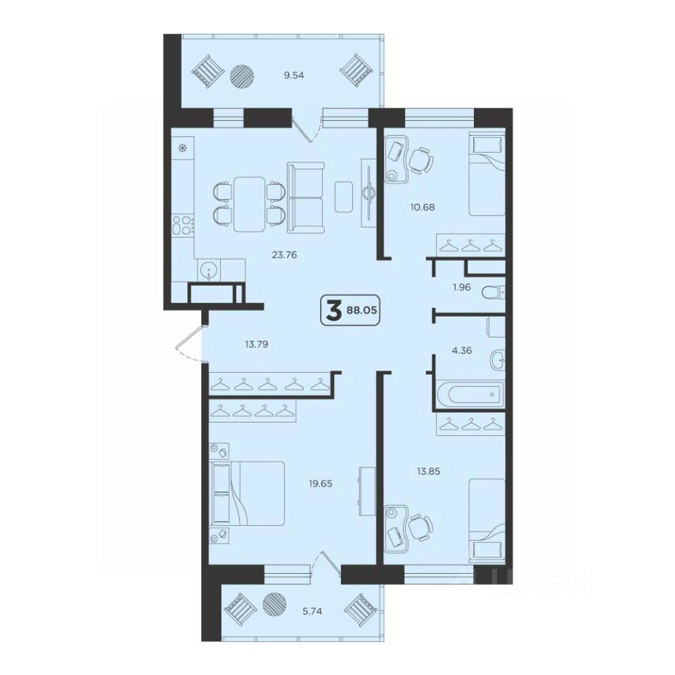 Продаётся 3-комнатная квартира в строящемся доме (ГП-4), срок сдачи: IV-кв. 2027, общей площадью 88.05 кв.м., на 21 этаже. Расположение, транспортная доступность