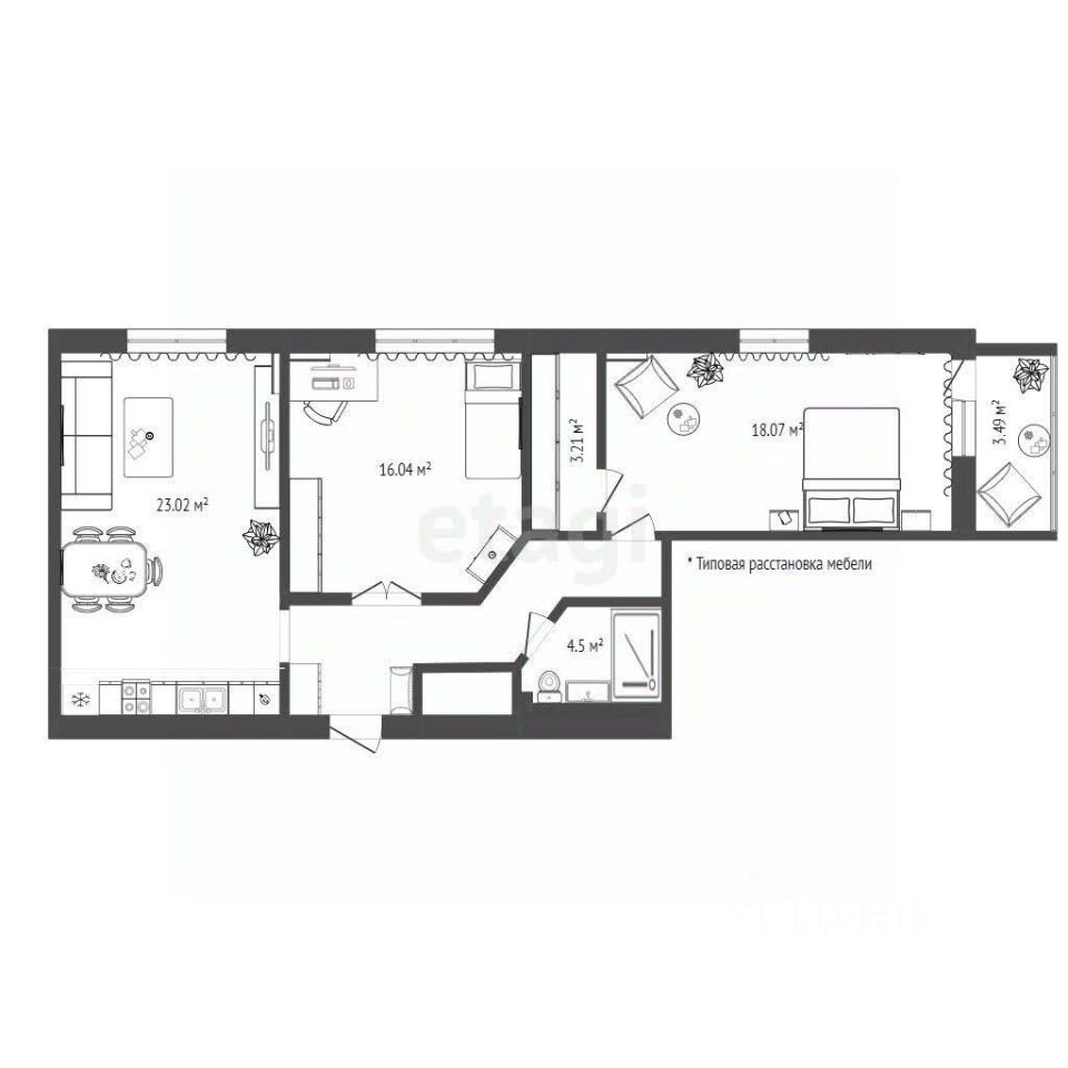 • Большая кухня-гостиная (23,2 м²) — уютное пространство для семейных ужинов и встреч с друзьями.