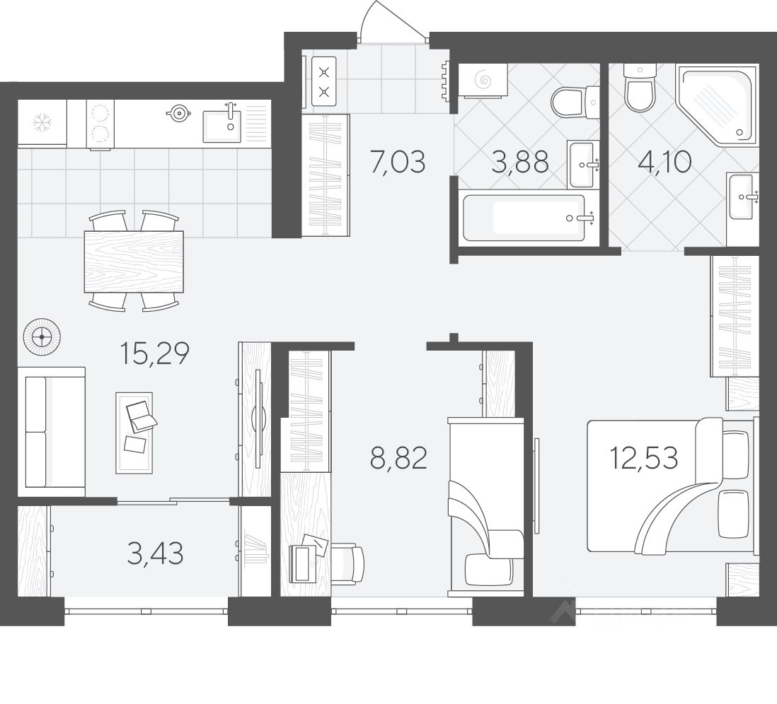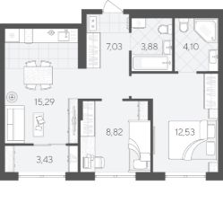 Квартира с двумя спальнями площадью 55.08 кв.м на 8 этаже с продуманной планировкой. Площадь квартиры условно разделена на гостевую зону и личное пространство только для вас и вашей семьи.