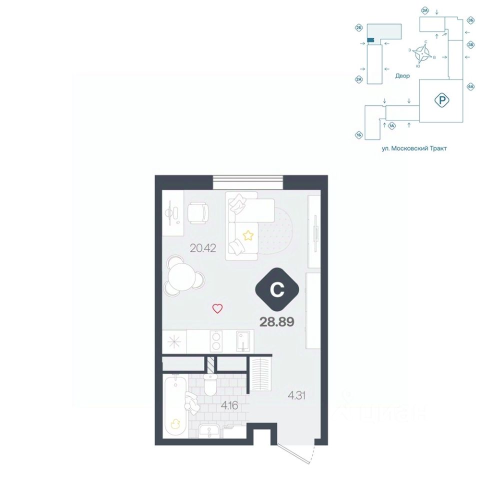 Вместительная студия с большой ванной комнатой и прихожей. В комнате предусмотрено грамотное зонирование на нишу и обеденную зону, а также на гостевую, которая легко трансформируется в спальню.