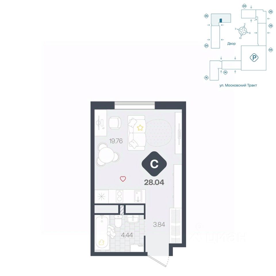 Уютная студия с просторной ванной и прихожей, в которой предусмотрена ниша для хранения. В кухне-гостиной органично зонировано пространство на нишу для приготовления, обеденную зону и место для отдыха. Подойдет для студентов и свободных молодых людей.