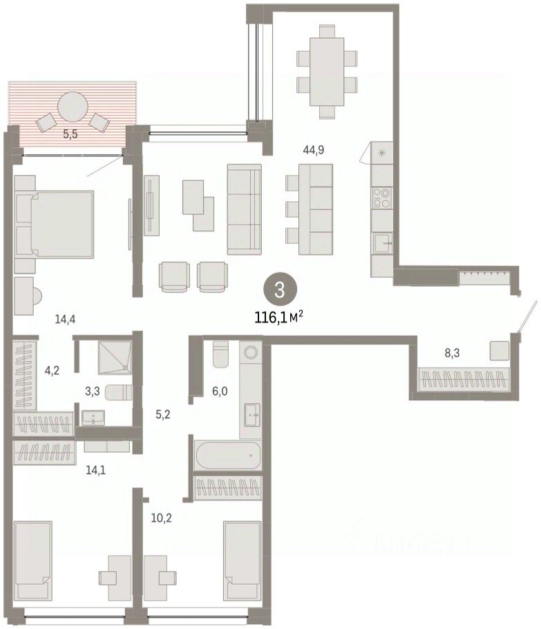 3-комн. квартира от застройщика с предчистовой отделкой в ЖК "Дом у озера" на 3 этаже. Общая площадь: 116.06 кв.м. Высота потолков 2.7 м.