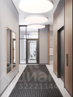 Декоративные перегородки, установленные в лобби, напоминают машрабию — элемент арабской архитектуры в виде узорной решетки. За счет мягкой мебели, многоуровневого освещения теплых оттенков и предметов декора (например, зеркал и картин) холлы воспринимаются как продолжение квартиры. #264vC0