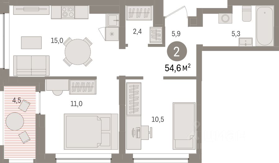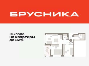 Квартира с кухней-гостиной и двумя спальнями в Доме у озера. Особенности планировки: гардеробная, лоджия, разнесённые спальни, предчистовая отделка.