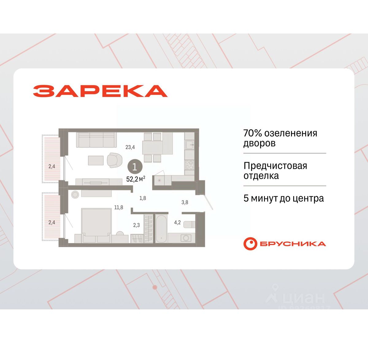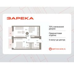 Однокомнатная квартира с предчистовой отделкой в ЖК "Зарека" на 3 этаже. Общая площадь: 52.23 кв.м., жилая: 11.8 кв.м., площадь просторной кухни-гостиной: 23.4 кв.м. Все окна выходят на одну сторону. В квартире два балкона, один совмещенный санузел. Высота потолков 2.7 м.