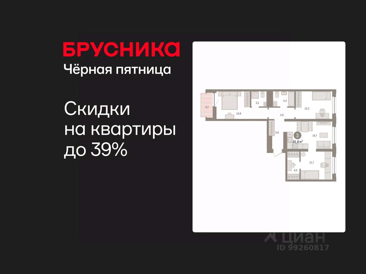 Квартира с кухней-гостиной и тремя спальнями в жилом районе "Речной порт". Особенности планировки: гардеробная, вид во двор, разнесённые спальни, предчистовая отделка, мастер-спальня, балкон.