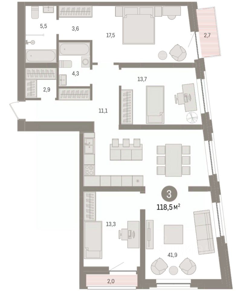 Квартира с кухней-гостиной и тремя спальнями в жилом районе "Речной порт". Особенности планировки: гардеробная, лоджия, разнесённые спальни, предчистовая отделка, мастер-спальня, балкон.
