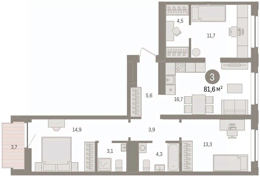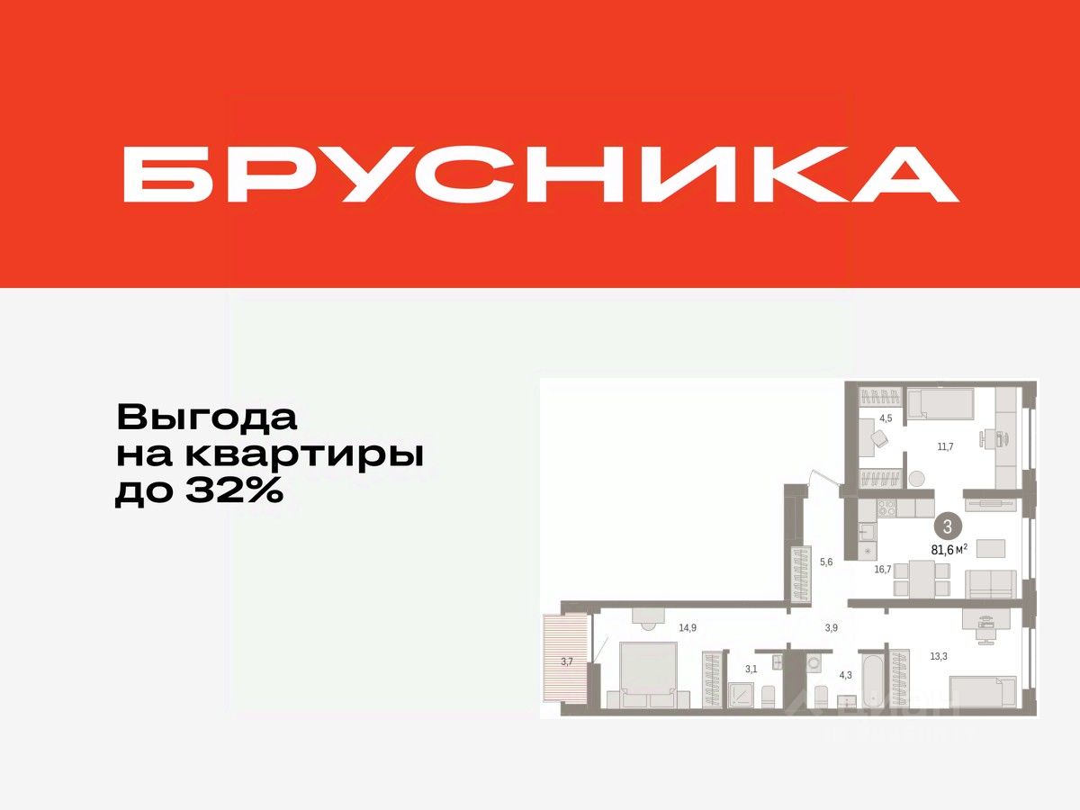 Квартира с кухней-гостиной и тремя спальнями в жилом районе "Речной порт". Особенности планировки: гардеробная, вид во двор, разнесённые спальни, предчистовая отделка, мастер-спальня, балкон.