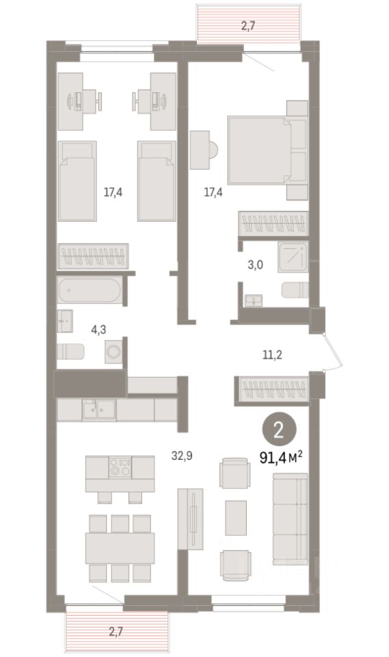 Квартира с кухней-гостиной и двумя спальнями в жилом районе "Речной порт". Особенности планировки: вид во двор, предчистовая отделка, мастер-спальня, балкон.