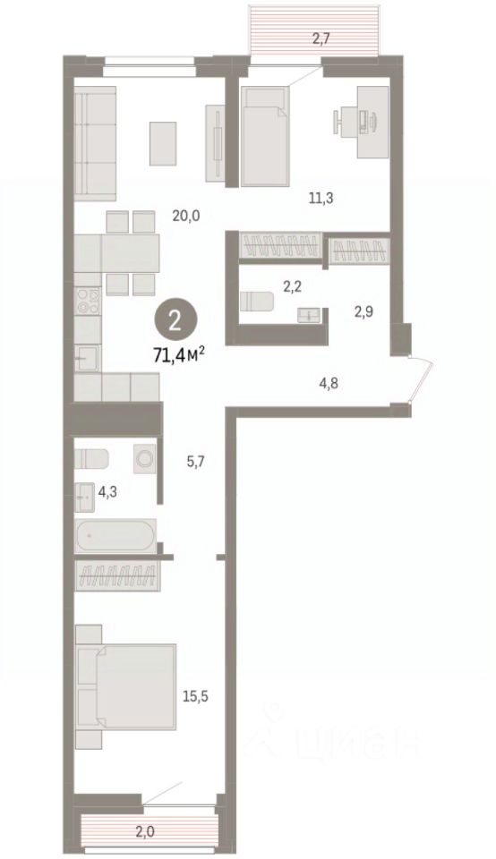 Квартира с кухней-гостиной и двумя спальнями в жилом районе "Речной порт". Особенности планировки: гардеробная, вид во двор, лоджия, разнесённые спальни, предчистовая отделка, мастер-спальня, балкон.