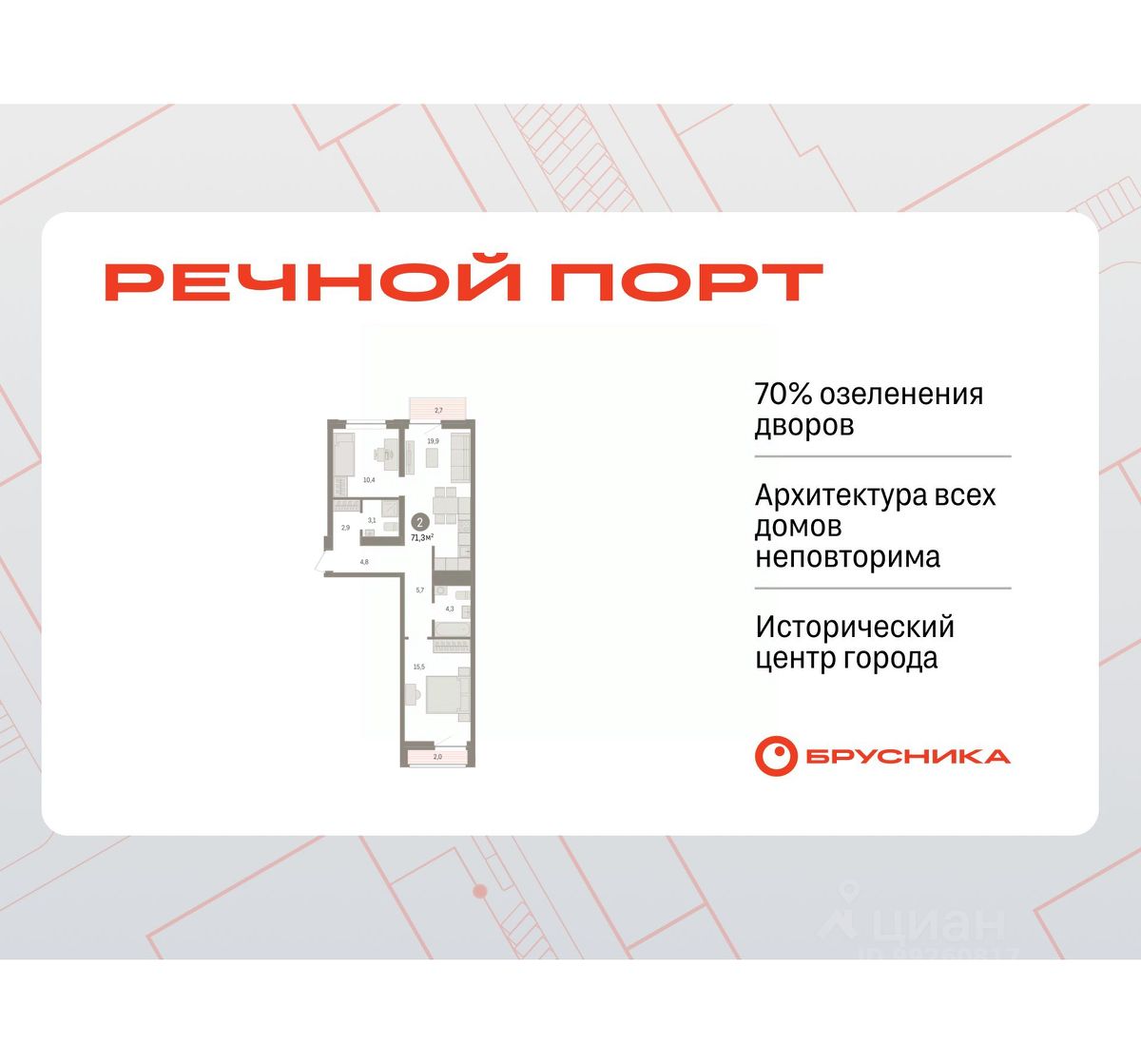 Квартира с кухней-гостиной и двумя спальнями в жилом районе "Речной порт". Особенности планировки: гардеробная, вид во двор, лоджия, разнесённые спальни, предчистовая отделка, мастер-спальня, балкон.