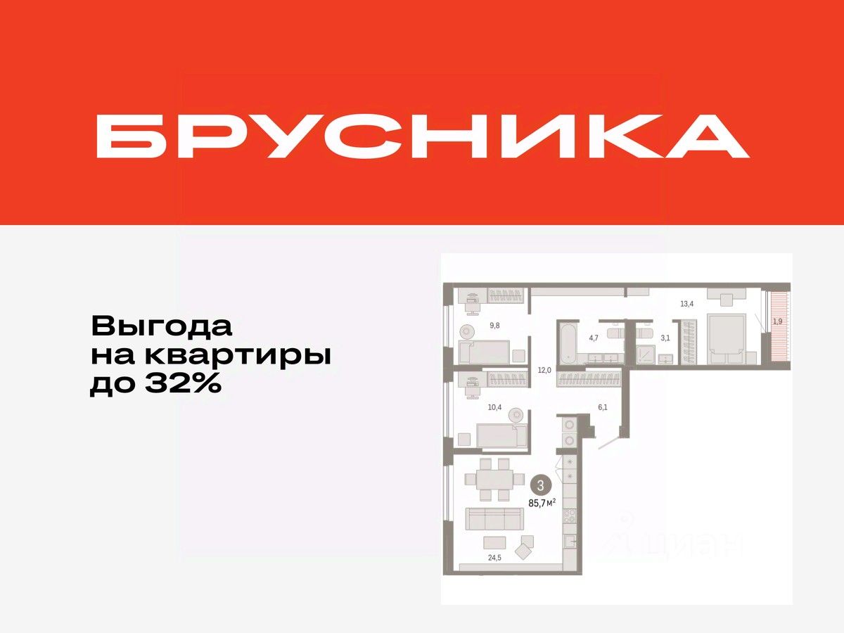 Квартира с кухней-гостиной и тремя спальнями в Октябрьском на Туре. Особенности планировки: вид во двор, лоджия, разнесённые спальни, предчистовая отделка, мастер-спальня.
